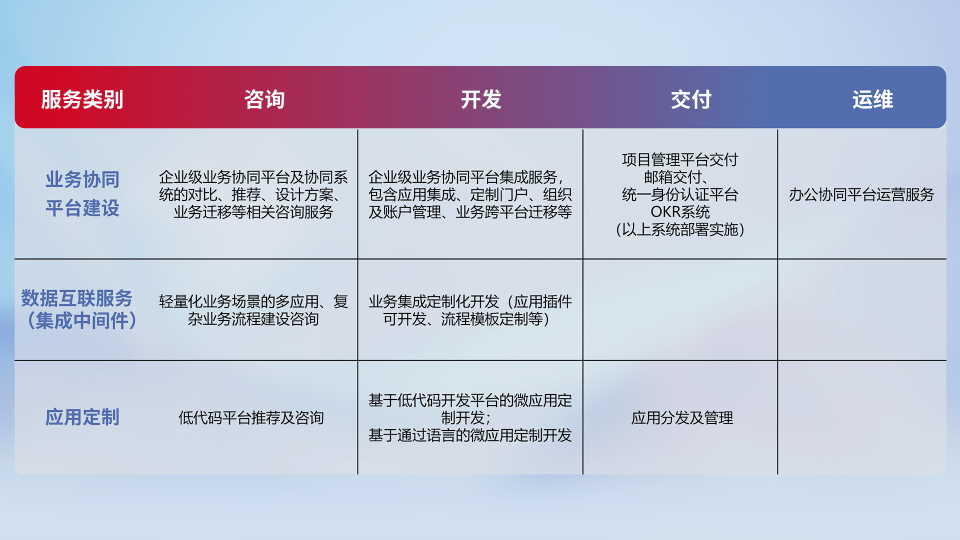 针对钉钉、、、企微、、IDaas等平台级产品提供产品的规划、、方案、、、交付、、、、定制化开发等服务,,实现如统一协同办公、、智能客户服务、、、、混合会议管理、、智能数据查询、、、等业务场景,,,,实现数字化转型。。。。
