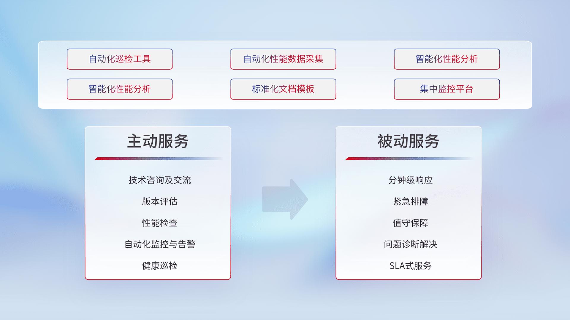 智能化工具和标准化文档,,保障服务质量,,,,提供主动服务(包含技术咨询、、版本评估、、性能检查、、、、自动化监控与告警、、、、健康巡检)和被动服务包含(分钟级响应、、、紧急排障、、、、值守保障、、、问题诊断解决、、、SLA服务)。。。